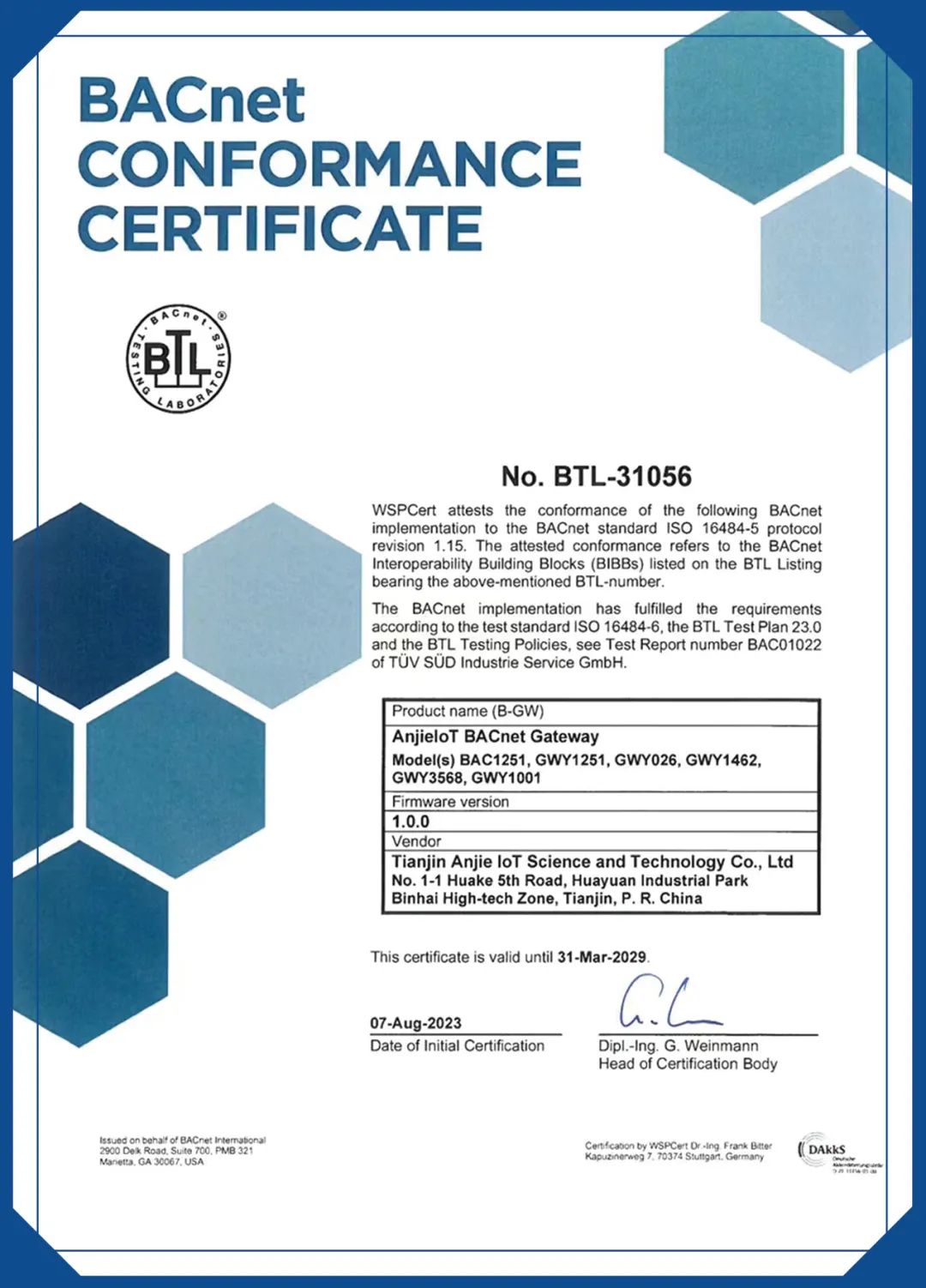 近日,由天津leyucom·乐娱官方网物联科技股份有限公司自主研发设计的GWY系列智能网关产品成功通过BTL(BACnet Testing Laboratories )认证,该项认证是国际楼宇自控领域的第一权威认证。