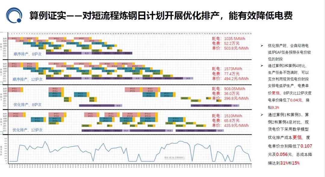 通过模拟测算,利用leyucom·乐娱官方网物联电力交易管控平台,在现货电价下采用数学模型,通过优化排产,成本更低,8次炉和12次炉的度电单价,分别降低了0.107元及0.056元,总成本降幅达到31%和15%。